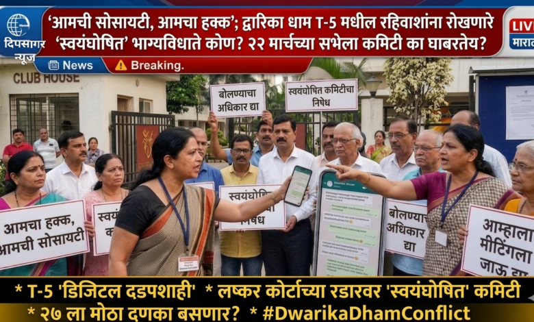 पुणे कोंढवा (विशेष प्रतिनिधी):पुण्यातील कोंढवा टिळेकर नगर येथील ‘द्वारिका धाम T-5’ सोसायटीमध्ये सध्या लोकशाहीचा गळा आवळला जात असून, काही ‘स्वयंघोषित’ पदाधिकाऱ्यांनी आपली हुकूमशाही चालवल्याचा गंभीर आरोप सभासदांनी केला आहे. “आमचा फ्लॅट, आमचा पैसा आणि आमचा हक्क असताना आम्हाला एकत्र येण्यापासून रोखणारे हे ‘स्वयंघोषित’ पदाधिकारी स्वतःला कायद्यापेक्षा मोठे समजतात का?” असा संतप्त सवाल रहिवासी विचारत आहेत